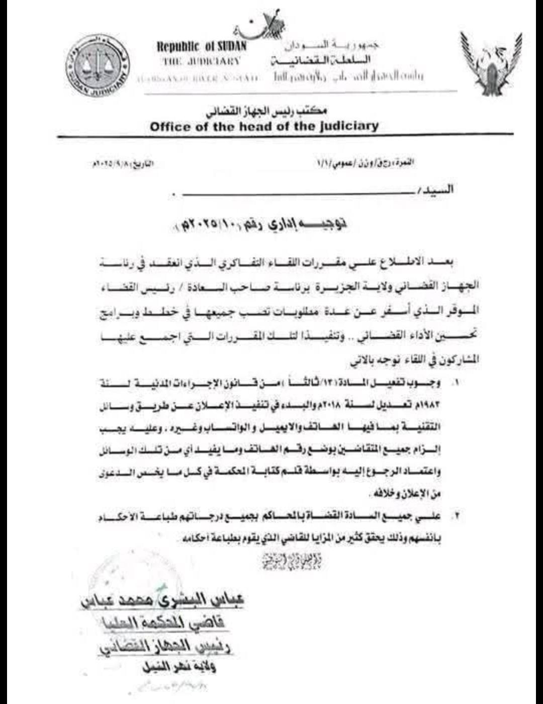 متابعة – اعتمد القضاء السوداني الإعلان عبر الهاتف والبريد الإلكتروني وتطبيق واتساب كطرق رسمية لإخطار المدعى عليهم، بناءً على التوجيه الإداري رقم (10) لعام 2025.