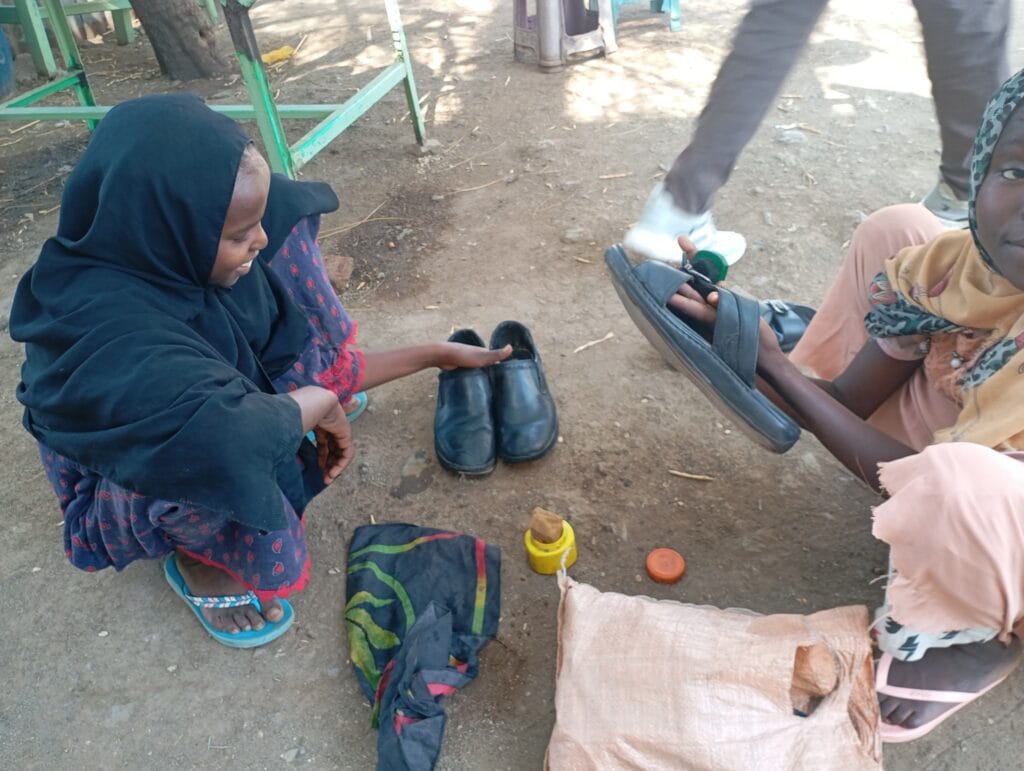بالنسبة للأطفال النازحين في ولاية القضارف شرق السودان، أصبح العمل في مهنة تلميع الأحذية (الأورنيش) أمرًا مألوفًا، وفقًا لبيانات ناشطين. هاتان البنتان، مروة موسى وحليمة النور حسن، ي働きان في هذا النوع من العمل رغم أنه يتضمن مهنة الرجال في السودان.