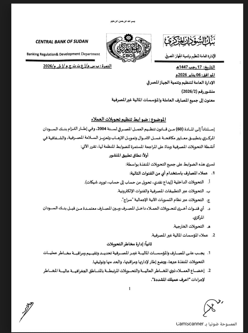 متابعات – أصدر بنك السودان ضوابط جديدة لتنظيم تحويلات العملاء، استناداً إلى المادة (60) من قانون تنظيم العمل المصرفي لسنة 2004. هذه الضوابط تأتي ضمن التزام البنك بتطبيق معايير مكافحة غسل الأموال وتمويل الإرهاب، وتعزيز السلامة المصرفية والشفافية في أنشطة التحويلات المصرفية.